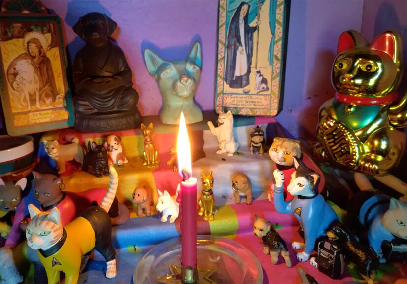 The Divine Harmony Pet Shrine is an altar at Divine Harmony Spiritual Church that is devoted to calling upon Saint Gertrude, the patron saint of cats, Saint Rocco, the patron saint of dogs, and Julian of Norwich, to watch over, protect, and heal our animal friends or animal lovers who are facing difficulties. Reverend Saint Germain will personalize the appeal to Saint Gertrude, Mother Julian, or Saint Rocco to meet your specific needs, and select the elements which will best serve your unique situation. This work may involve a mixture of ceremonial rootwork, candle vigils, sacred relics, animal totems, and prayer to petition Saint Gertrude to lend her divine influence to your cause. Depending on the type of ceremony, prayers may last 3 to 5 days. You will receive pictures of the work along with Reverend Saint Germain's observations and interpretations of any omens or signs that were seen during the ceremony.